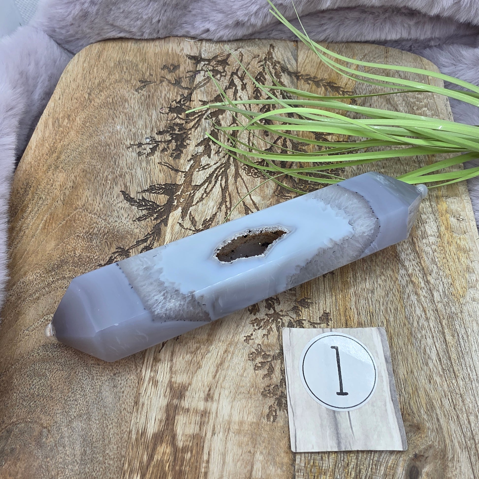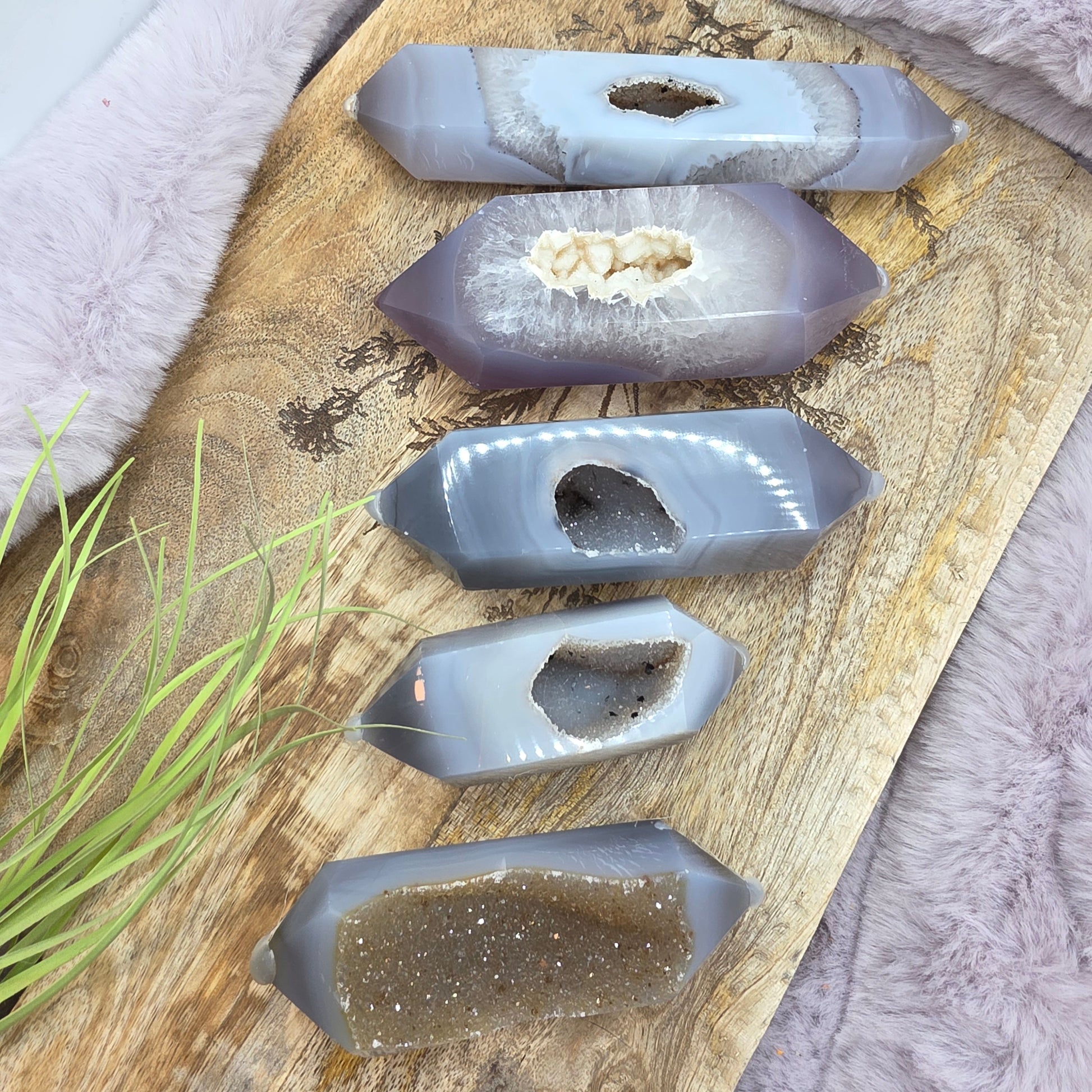 Keskellä "druzy" joka voi olla kalsiittia tai kvartsia. Kärjet on suojattu kuumaliimalla. Poista suoja varoen lämmittäen sitä kuman veden alla. Brasilia.