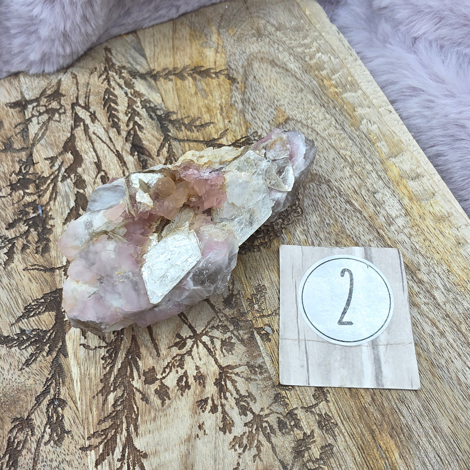 Harvinaista kristallikiteistä Canga Rosa ruusukvartsia emokivessä (kalsiitti/kvartsi). Kivi voi sisältää myös muskoviittia ja childreniittiä.