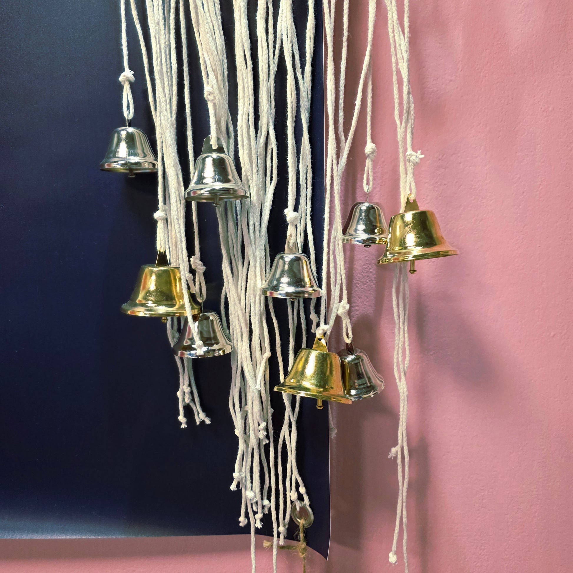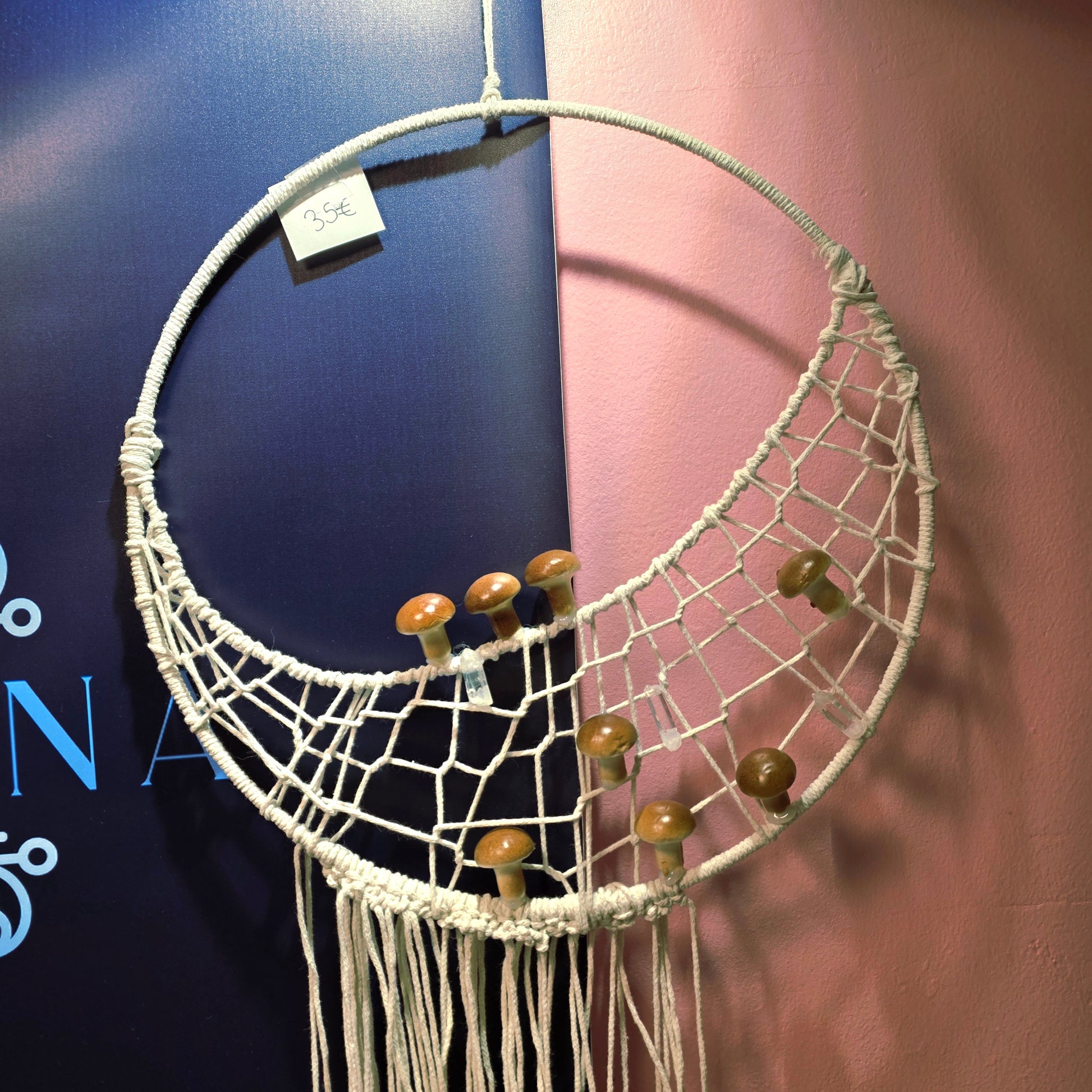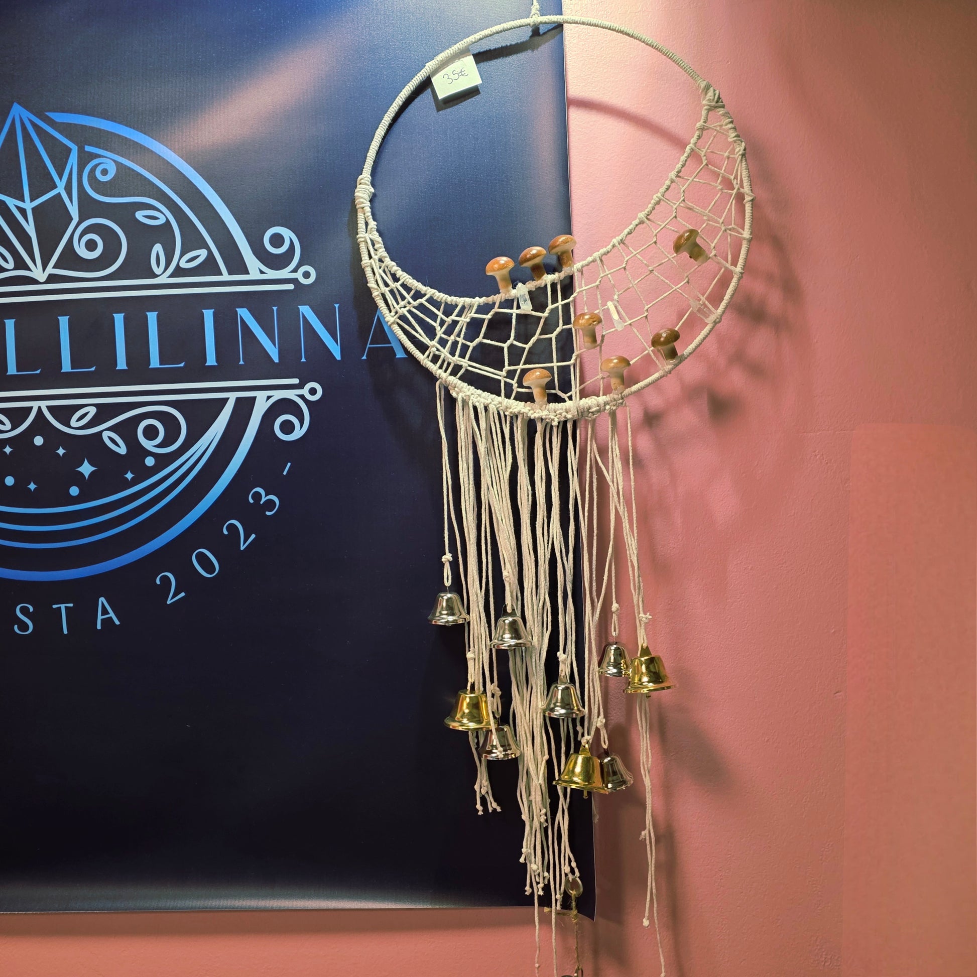 Kotimainen käsityö. Puuvillalankaa, metallikelloja, muovisieniä ja kristalleja. Kokonaispituus ilman kiinnitysnauhaa on n. 80cm ja ympyrä leveys on n. 35cm. Design by: Noidanpata