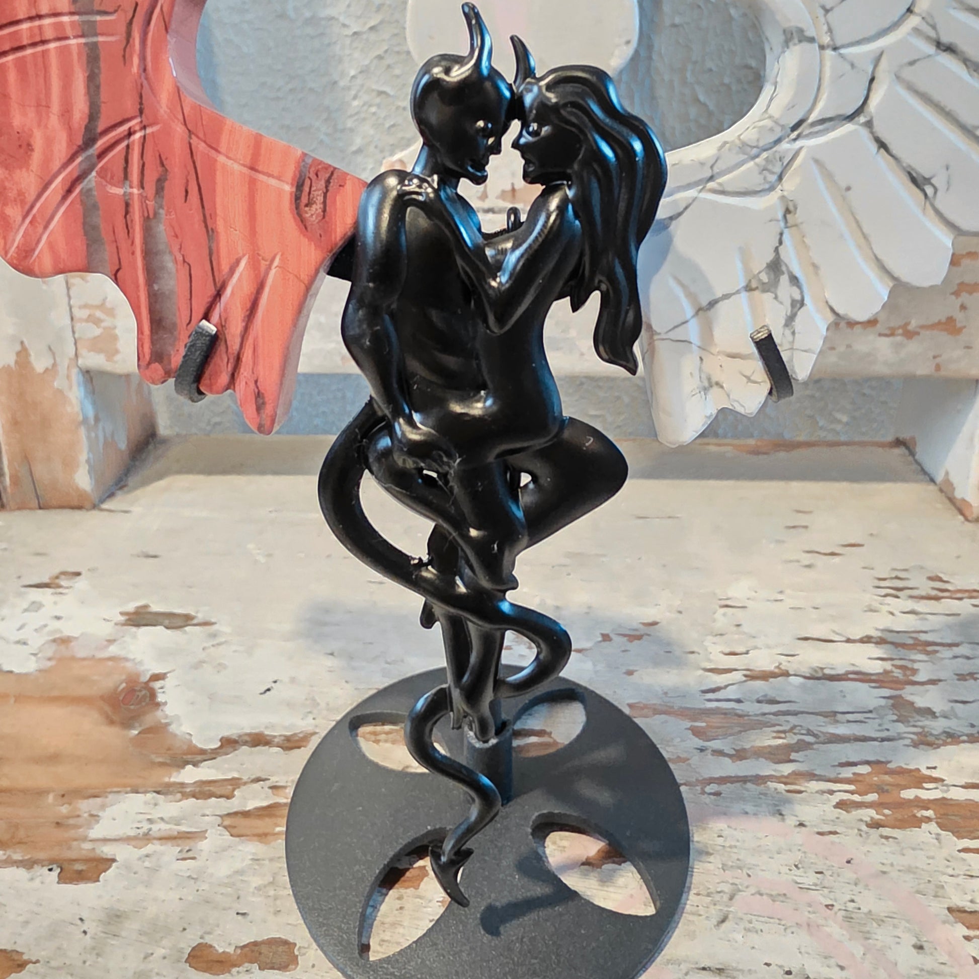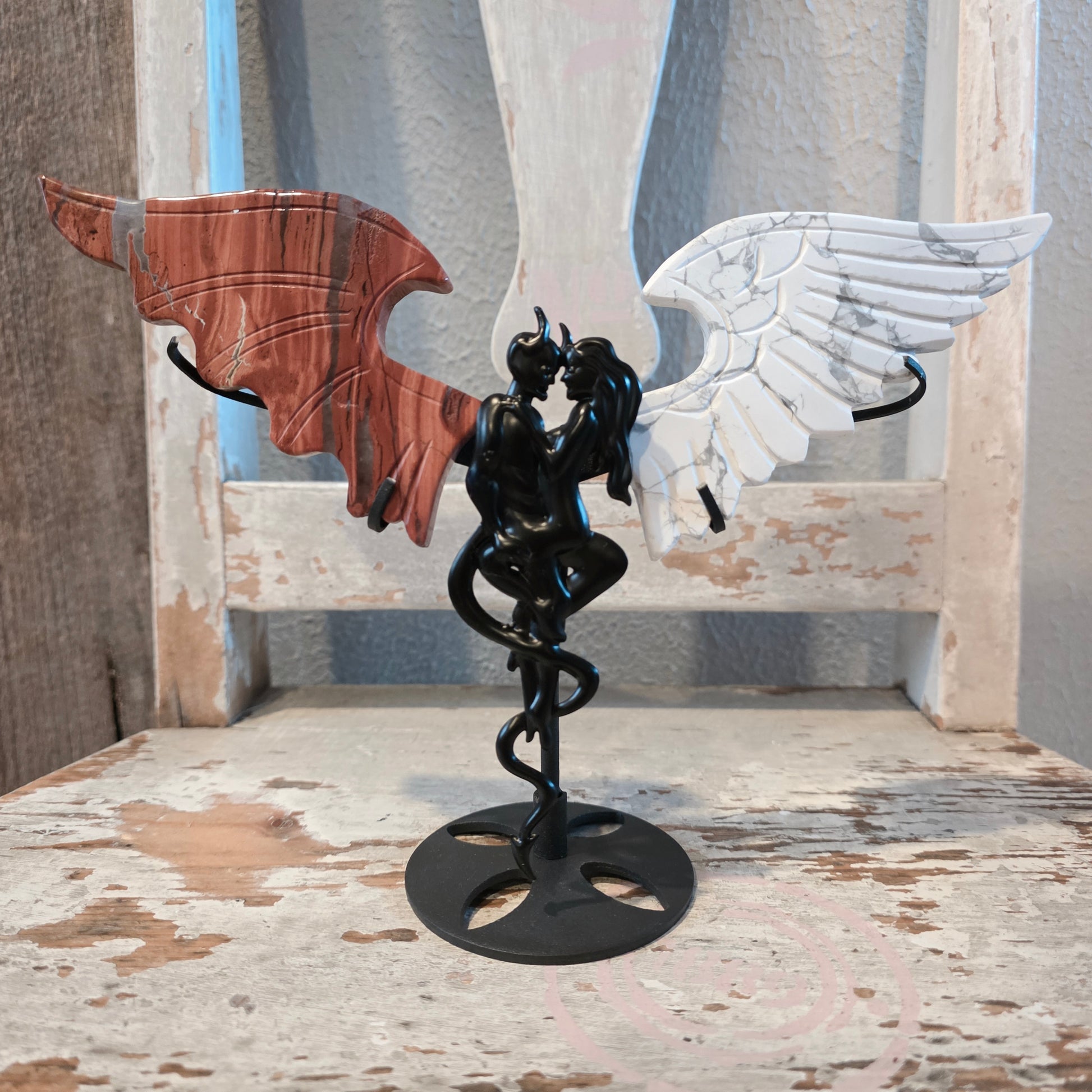 Kokonaiskorkeus on n.16cm ja leveys 21cm. Mustaksimaalattu metalliteline ja siivet kiveä