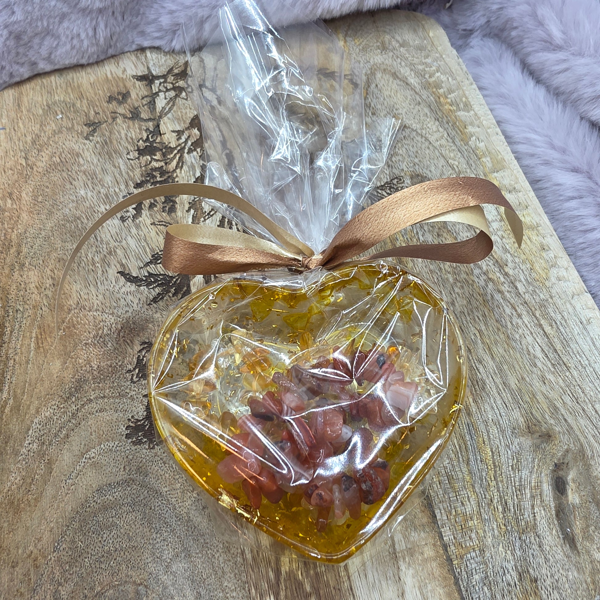Setti sisältää muovisen sydänkipon (7.5x2.5cm) ja 2kpl sirurannekoruja (sitriini ja karneoli)