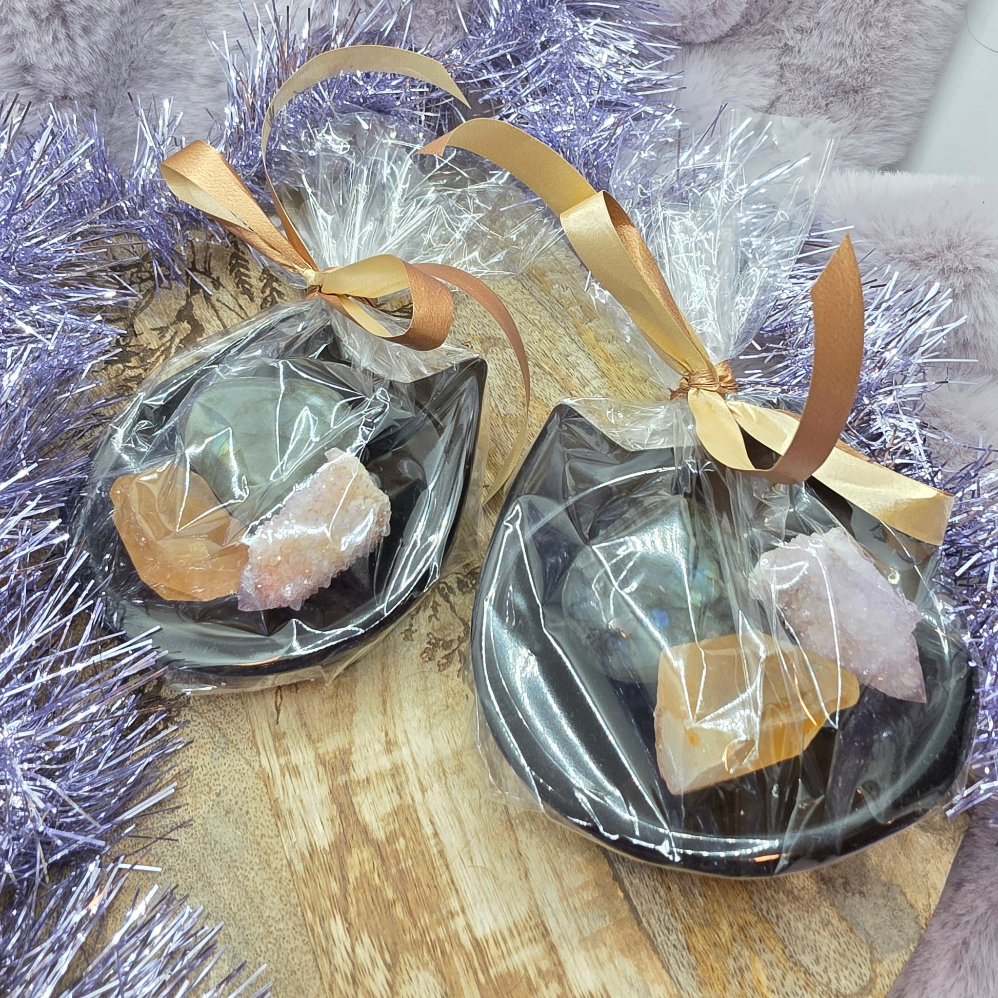 Pakkaus sisältää: obsidiaani alusta (9x9cm), spirit-kvartsi ametisti, labradoriitti ja mandariinikvartsi.