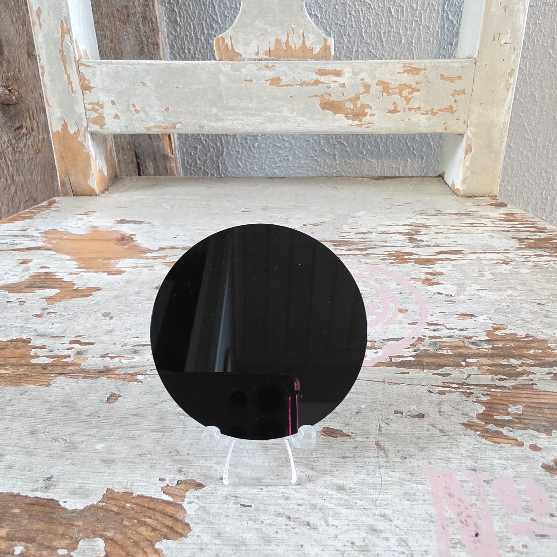Mustapeili on lasia. Sen mitat on n. 6cm x 0.5cm. Teline EI kuulu hintaan