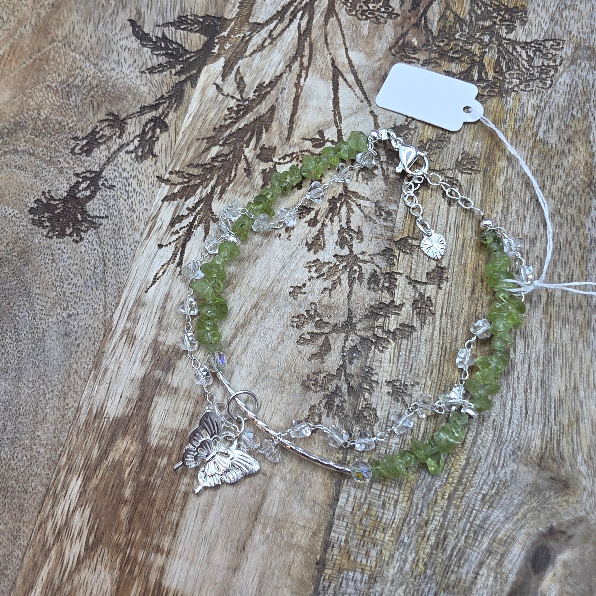 Peridootti, kasi ja korumetalli. Mitat: maksimi 21cm ja minimi 18cm.