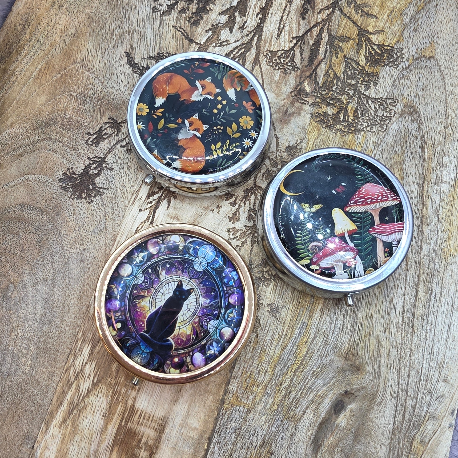 Rasia on metallia ja sisäosa on muovia. Sisäkannessa on peili. Mitat on n. 5x1.5cm