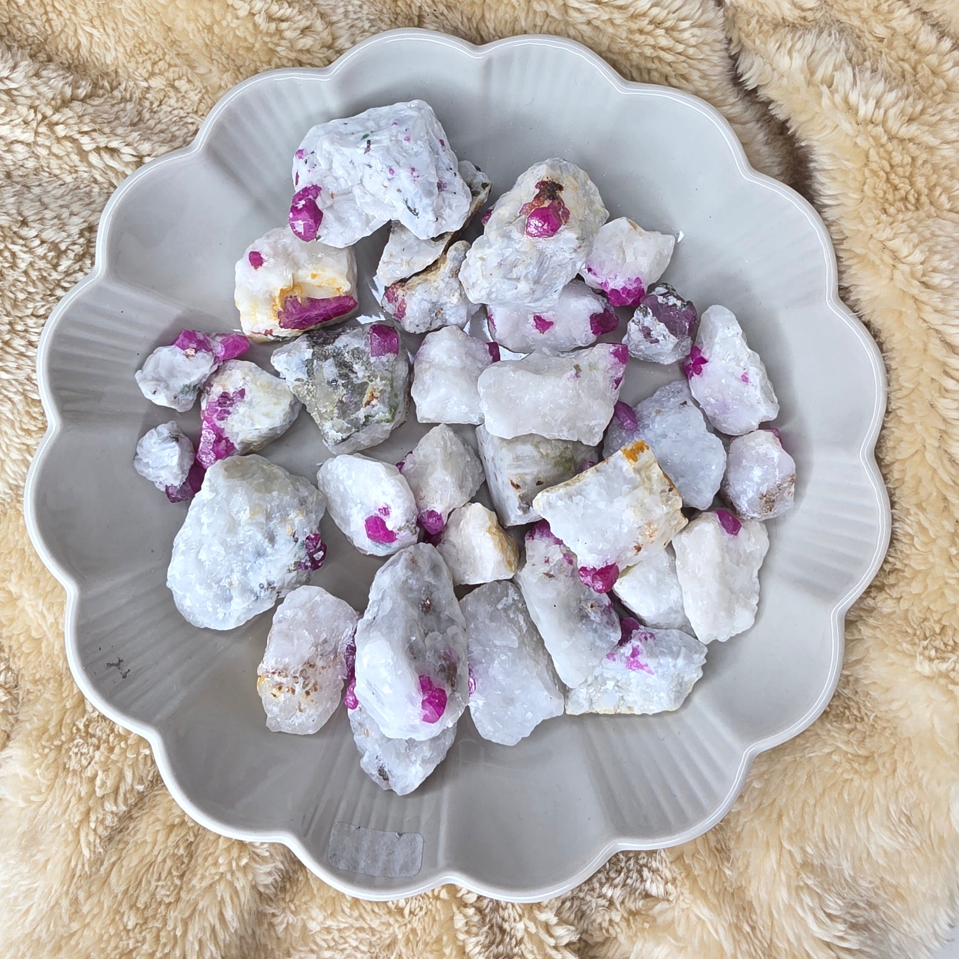 Emokivessä (kalsiitti) on yksi tai useampi rubiini. Kiven läpimitta on n. 2-4cm. Sattumanvarainen valinta