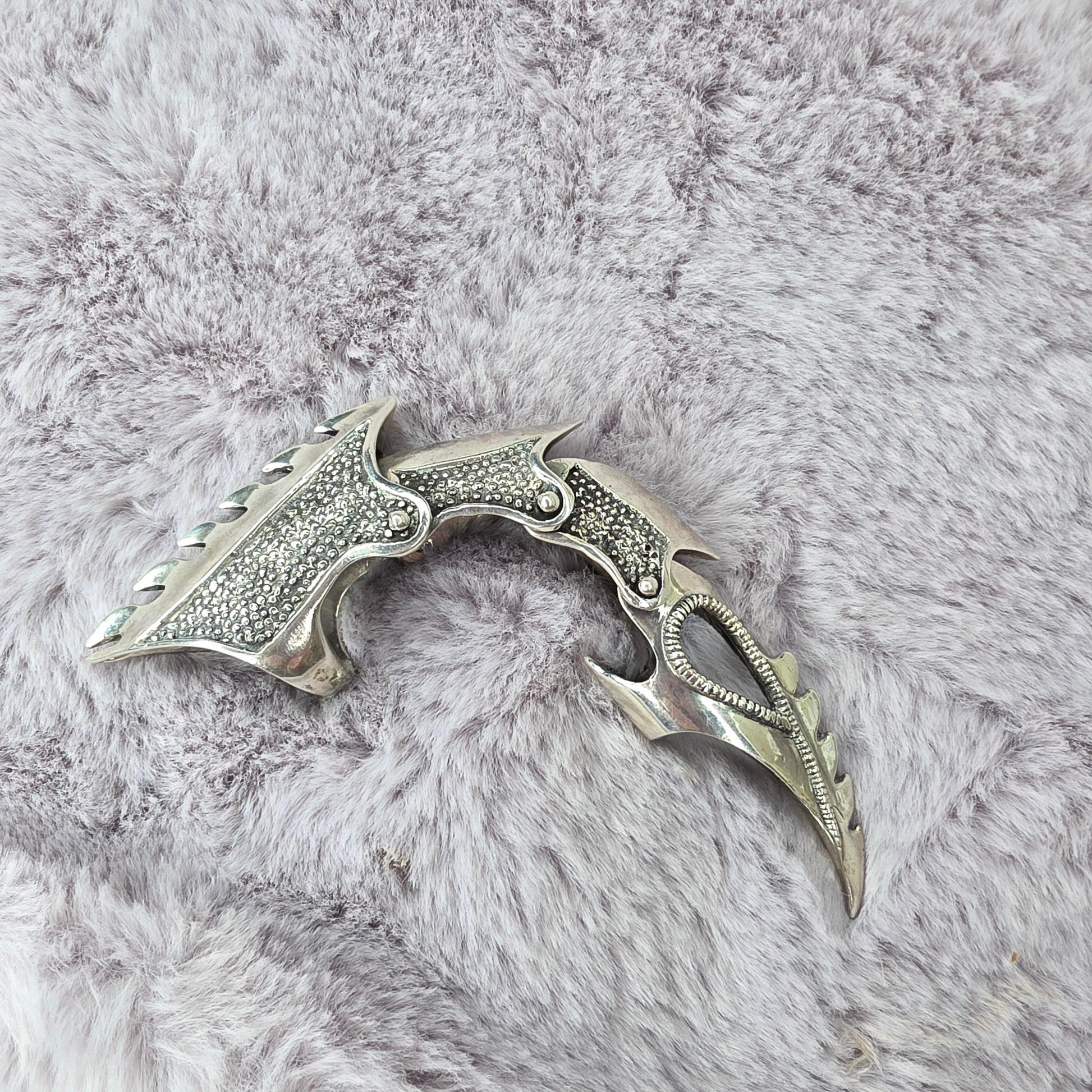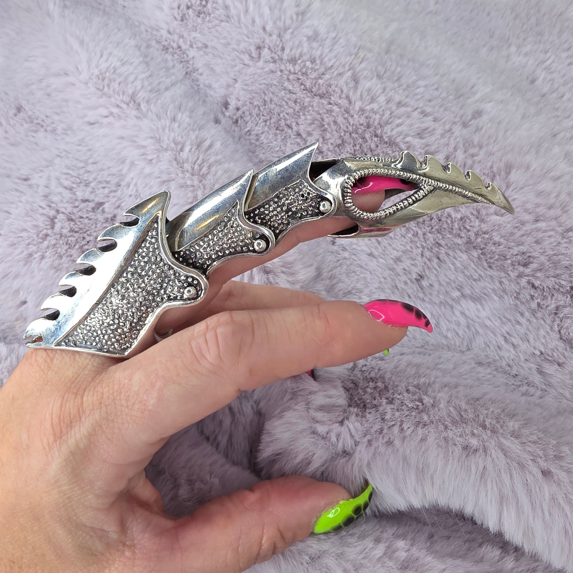 Koru on 925 hopeaa ja siinä on liikkuvat nivelet. Kokonaispituus on n.13cm. Yläosan sormusrenkaan läpimitta on n.2cm.