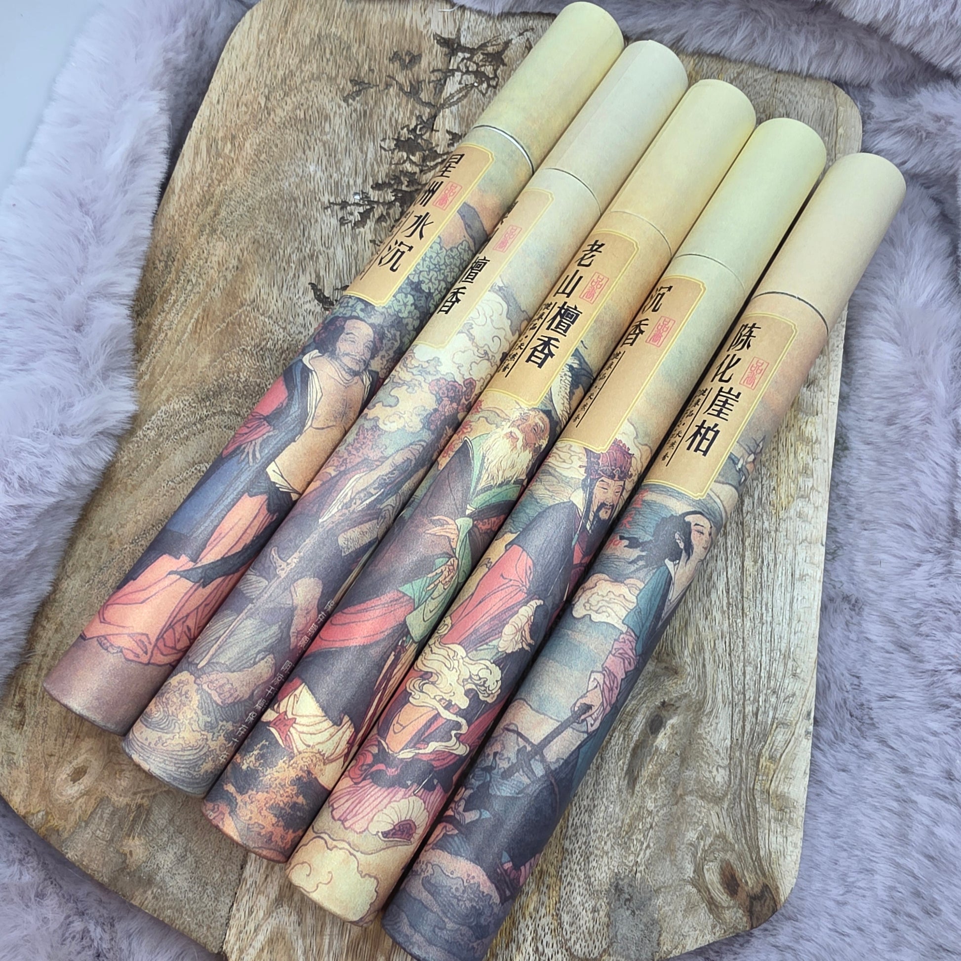 Kartonkiputkilon pituus on n. 22cm ja kuva-aiheena "kiinalaiset mieshahmot". Putkilo sisältää minimissään 40kpl suitsuketikkuja joissa mieto kukkaistuoksu. Sattumanvarainen valinta