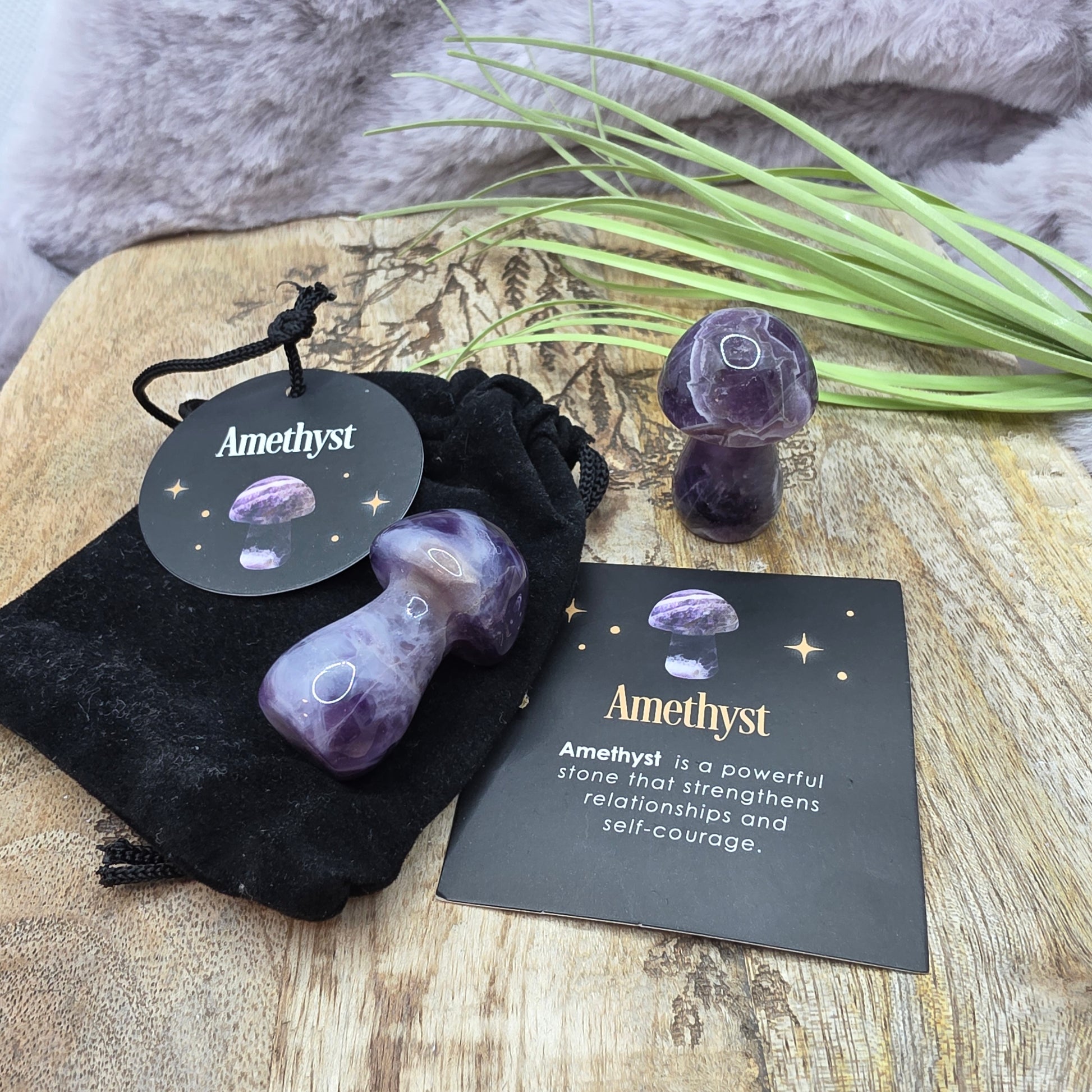 Setti sisältää yhden Chevron-ametisti sienen (3.5cm), samettipussin (9.5x6.5cm) ja energialapun.
