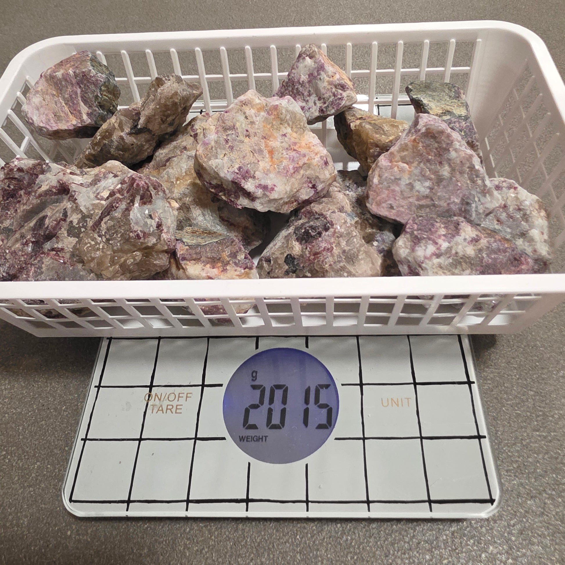 Yksittäisen kiven läpimitta on n.3-9cm. Reilu 2kg erä pinkkiä turmaliinia eli rubelliittia emokivessä (kalsiitti/kvartsi).