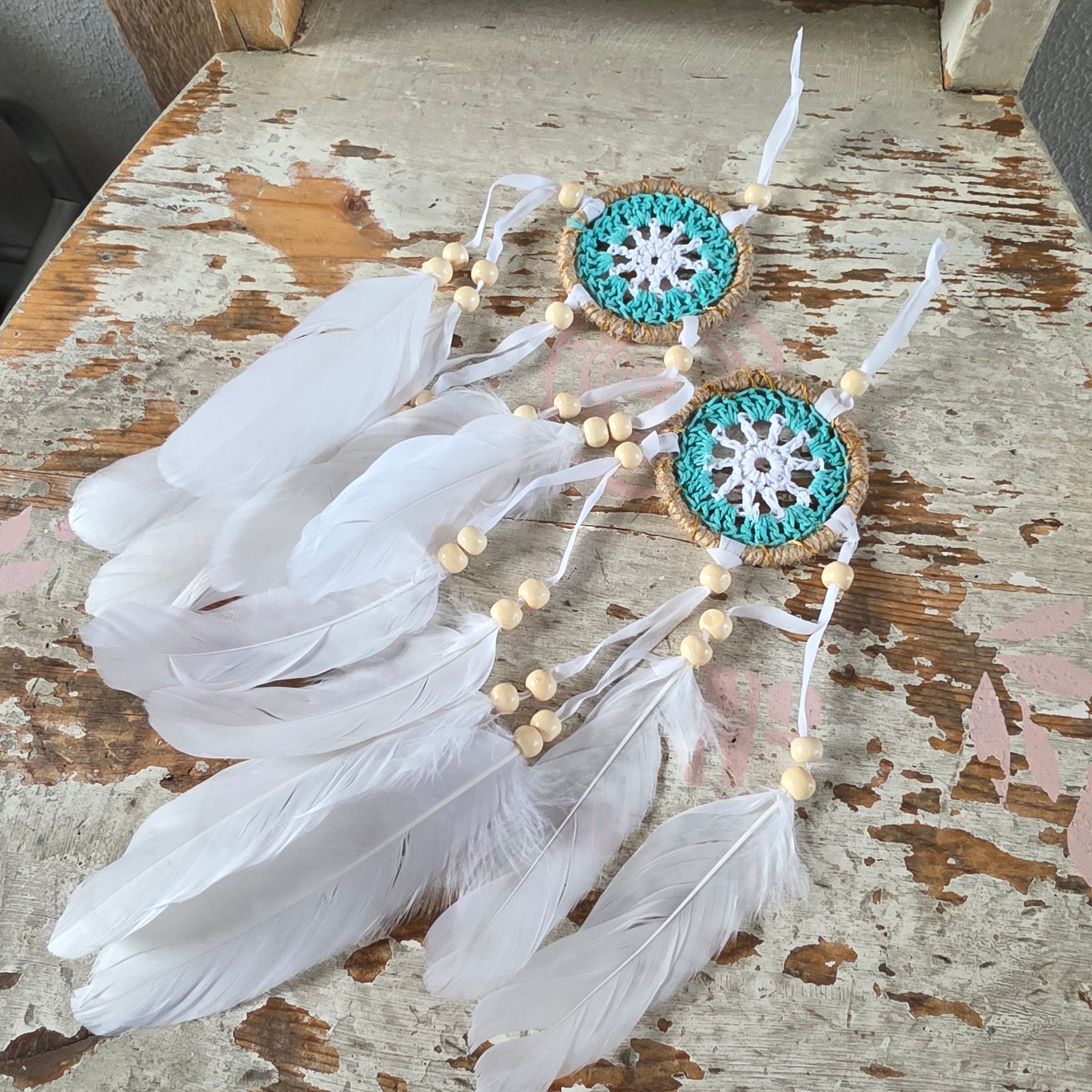 Puuhelmiä, lankaa ja sulkia. Kokonaispituus on n.32cm